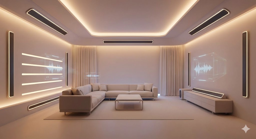 In-Wall Utopia: Speakers aren’t on the wall; they are the wall. Flat-panel speakers and exciters are evolving, using the wall itself as the diaphragm, radiating sound evenly across the surface. This creates an even, ambient sound field that is perfect for background music or environmental noise masking (a la the HomePod Mini’s white noise function, but scaled up).